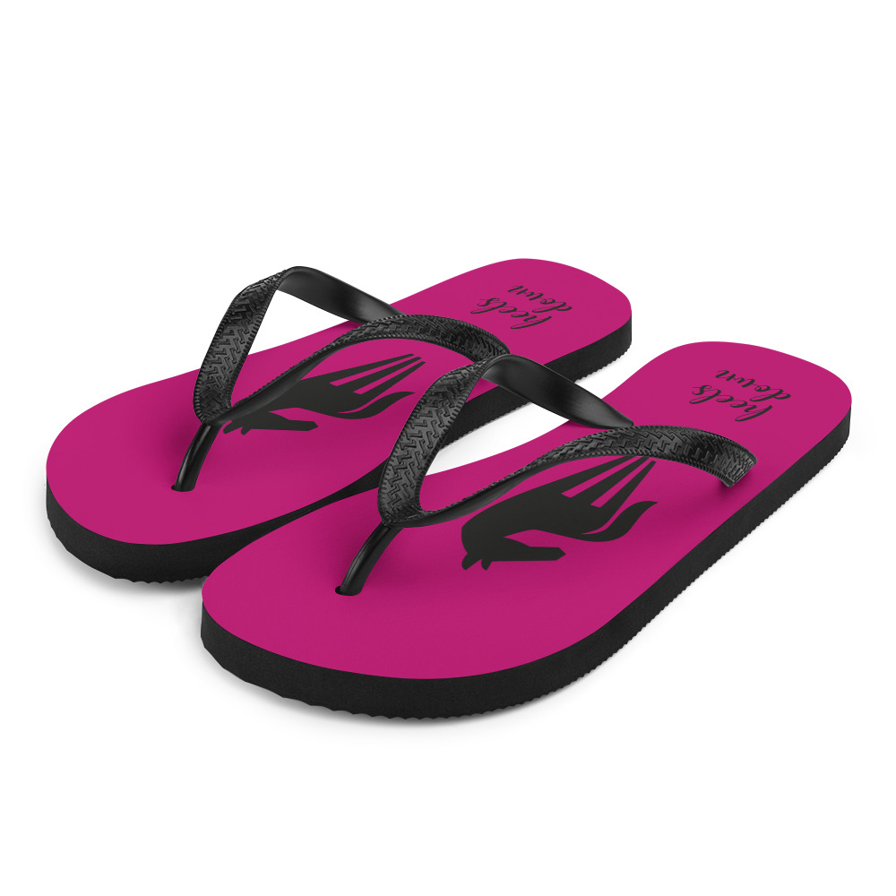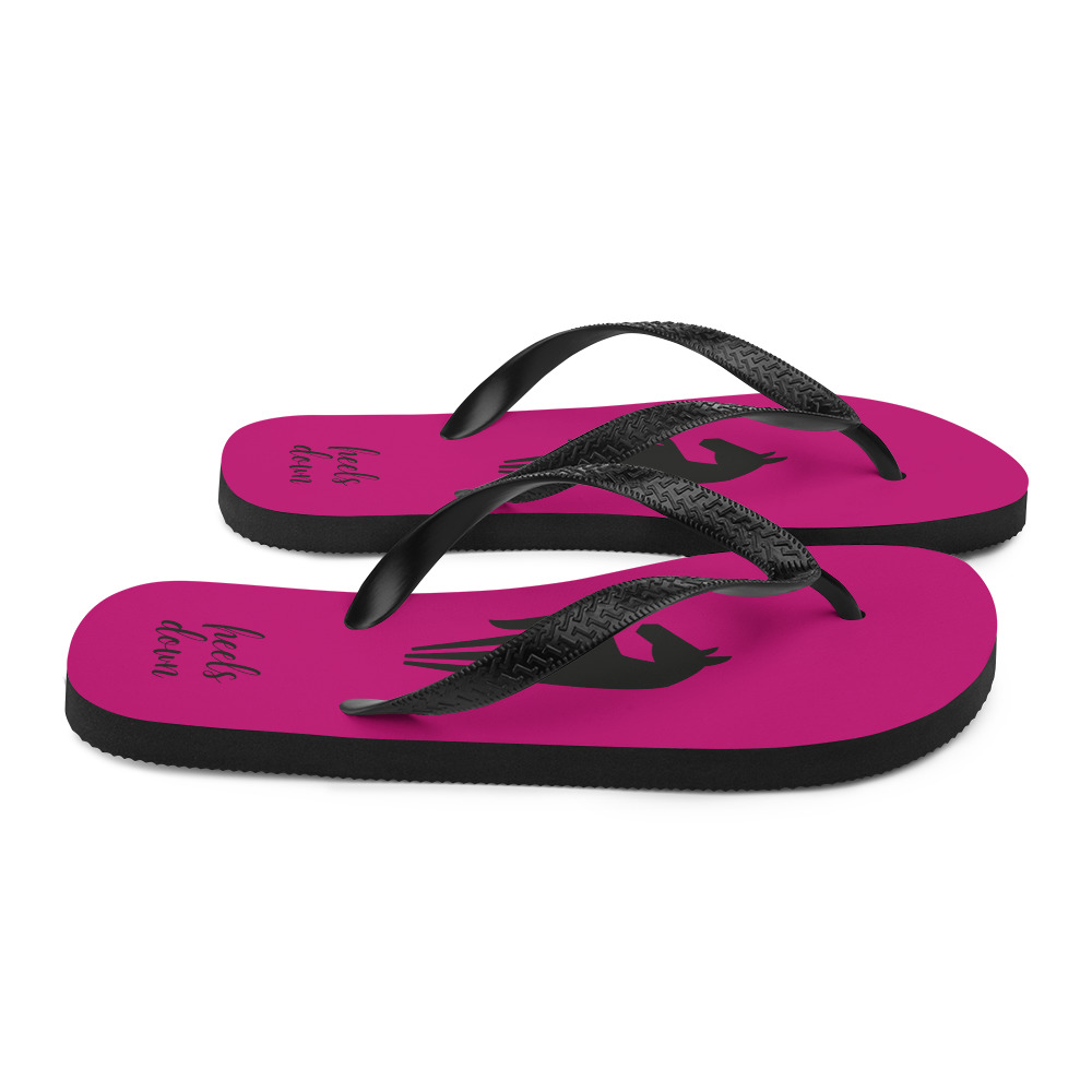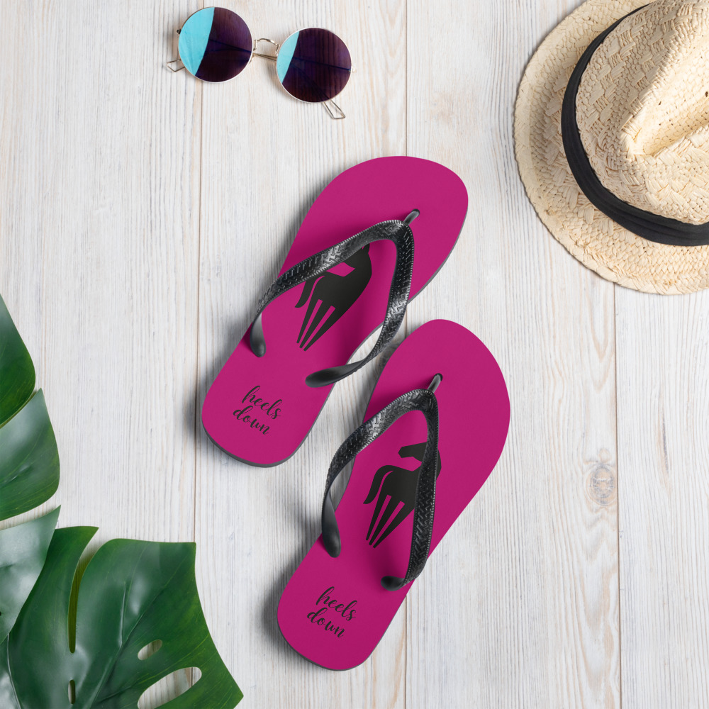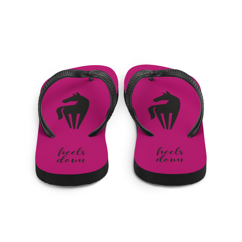 Hästiga flip-flops med foder i cerise färg med hästsiluett i svart och texten ”Heels down”.