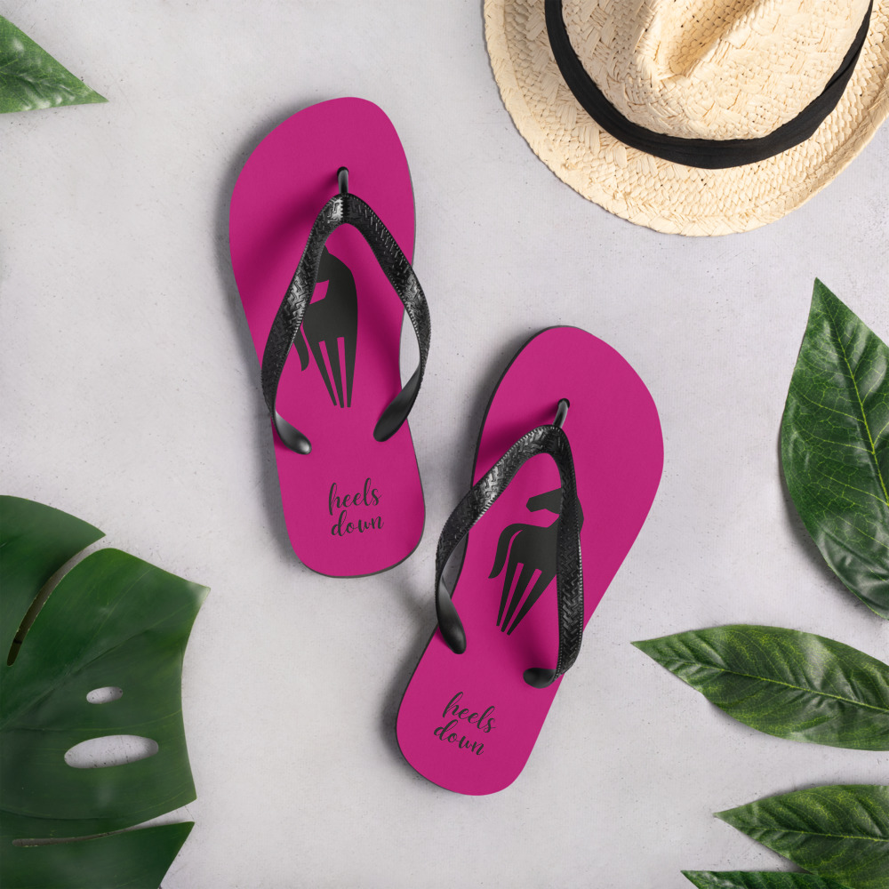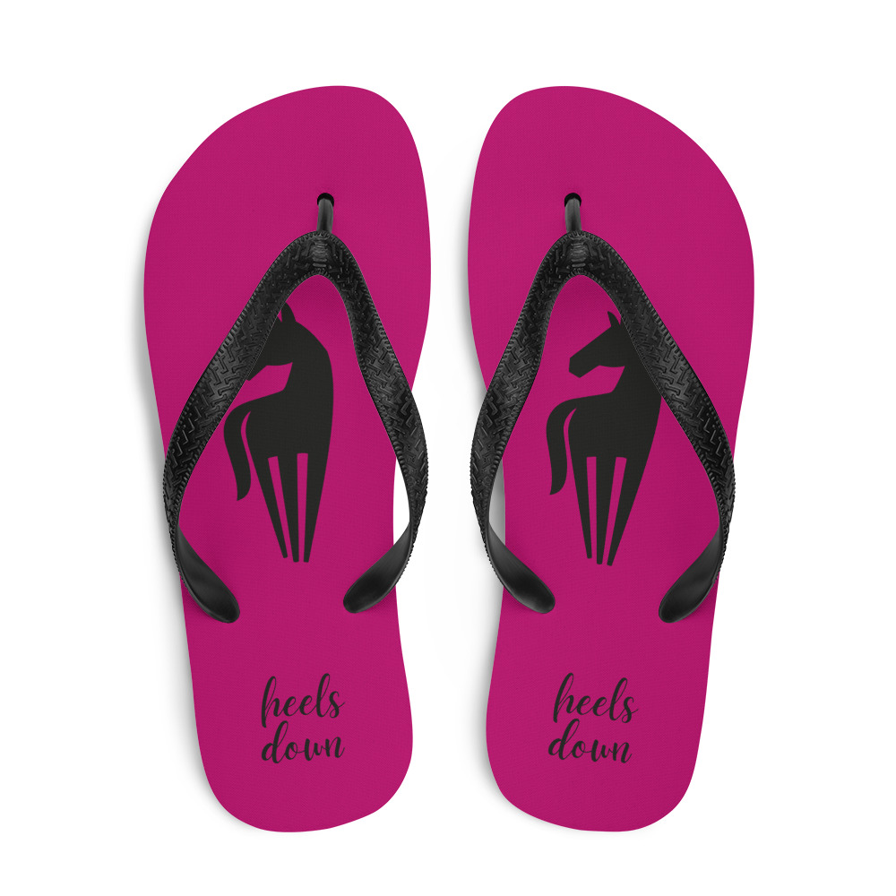 Färgglada flipflops som kombinerar komfort och stil med en touch av hästpassion. Foder i cerise färg med hästsiluett i svart och texten “Heels down”.