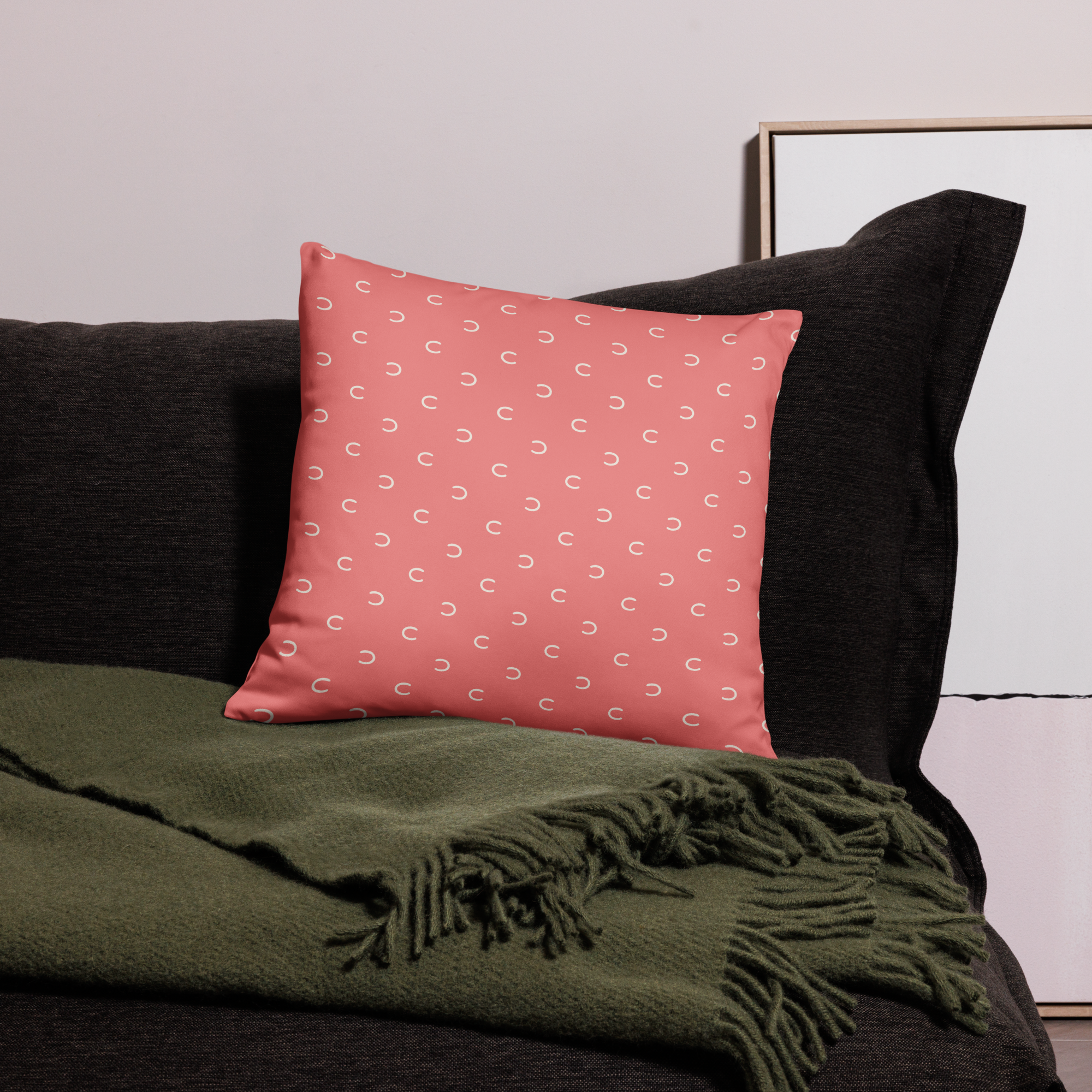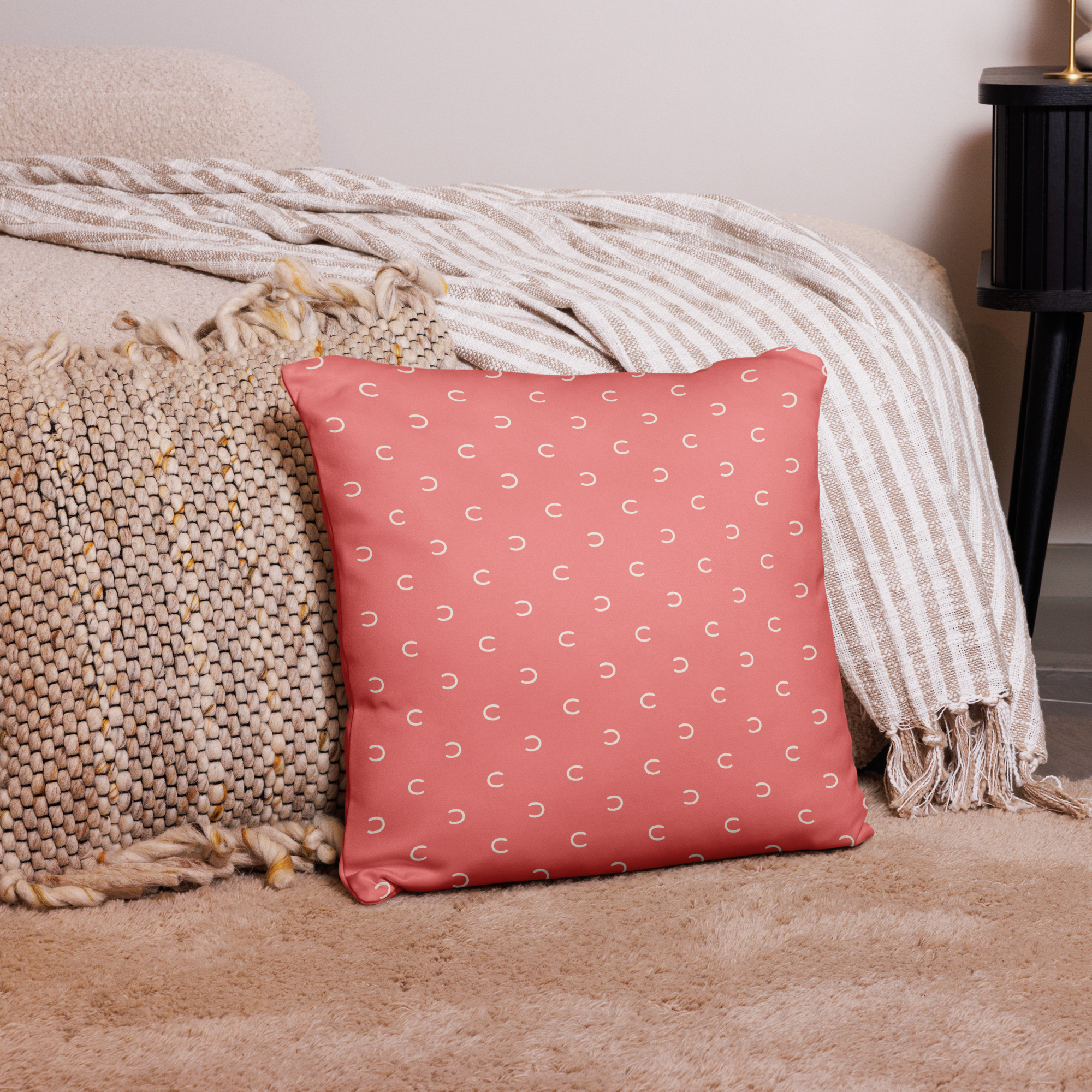 Ett kuddfodral i färgen korall i vår produktserie “Hoof Print” i färgpaletten “Vårgrönska”.